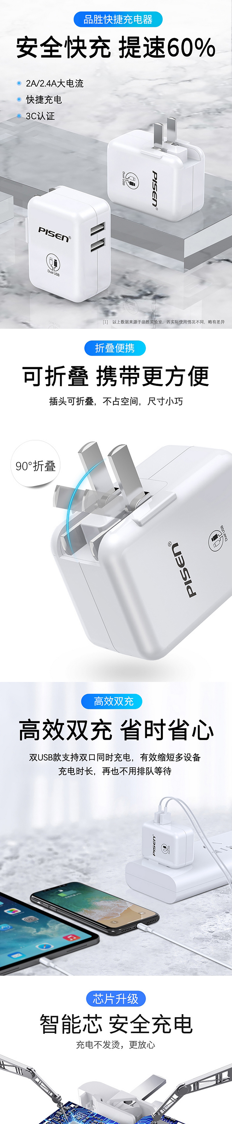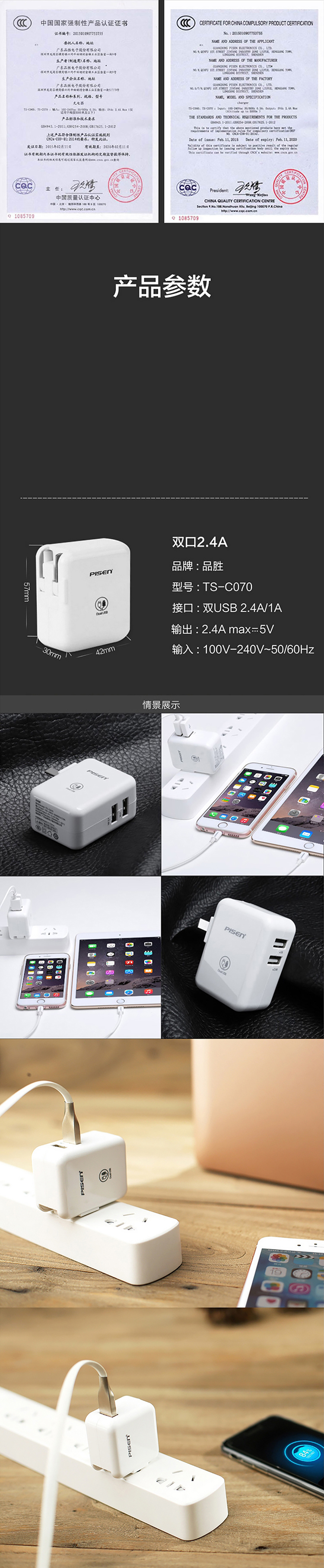 品胜 TS-C070 iPad 2.4A双口USB充电器(单位:个) 白色