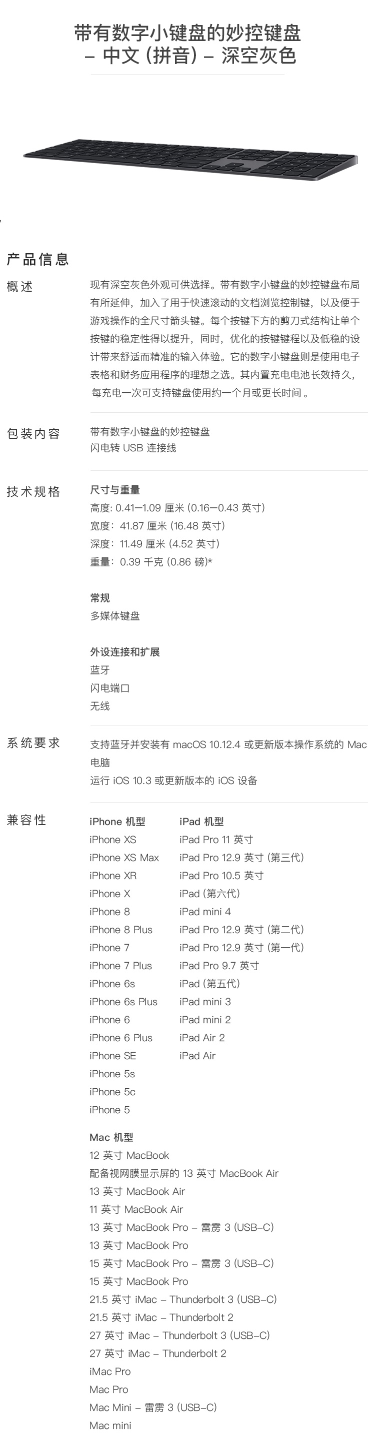 Apple AppleMRMH2CH/A 带有数字小键盘的妙控键盘 中文 (拼音) 深空灰(单位:个)
