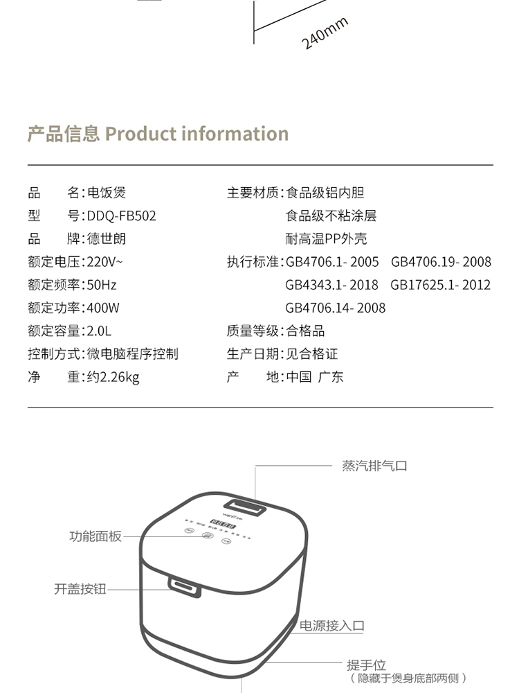 德世朗 DDQ-FB502 电饭煲 白色(单位:台)