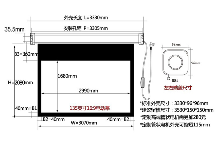 红叶 135寸 16:9电动玻珠遥控幕布...
