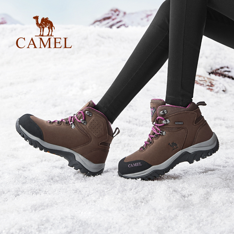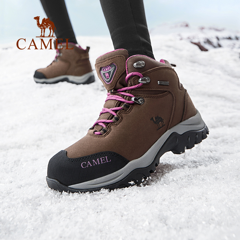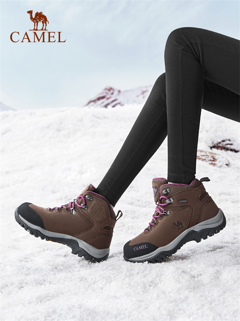 CAMEL骆驼山系户外专业登山鞋男防水防滑冬季耐磨牛皮高帮靴女士徒步鞋 咖啡/紫红 39(单位:件)